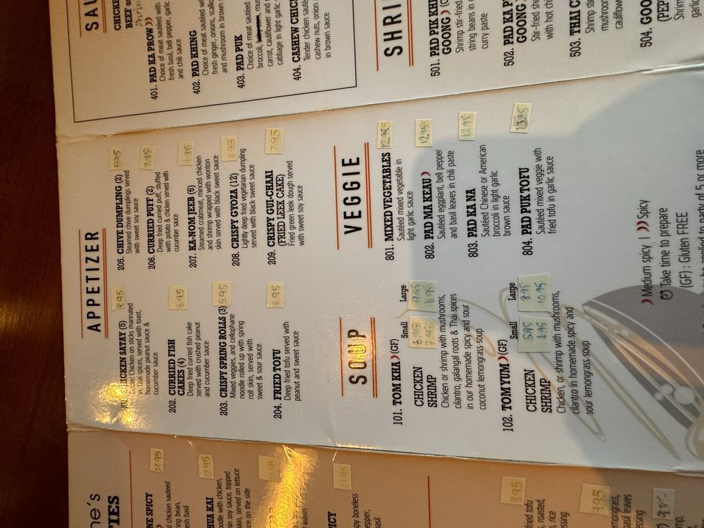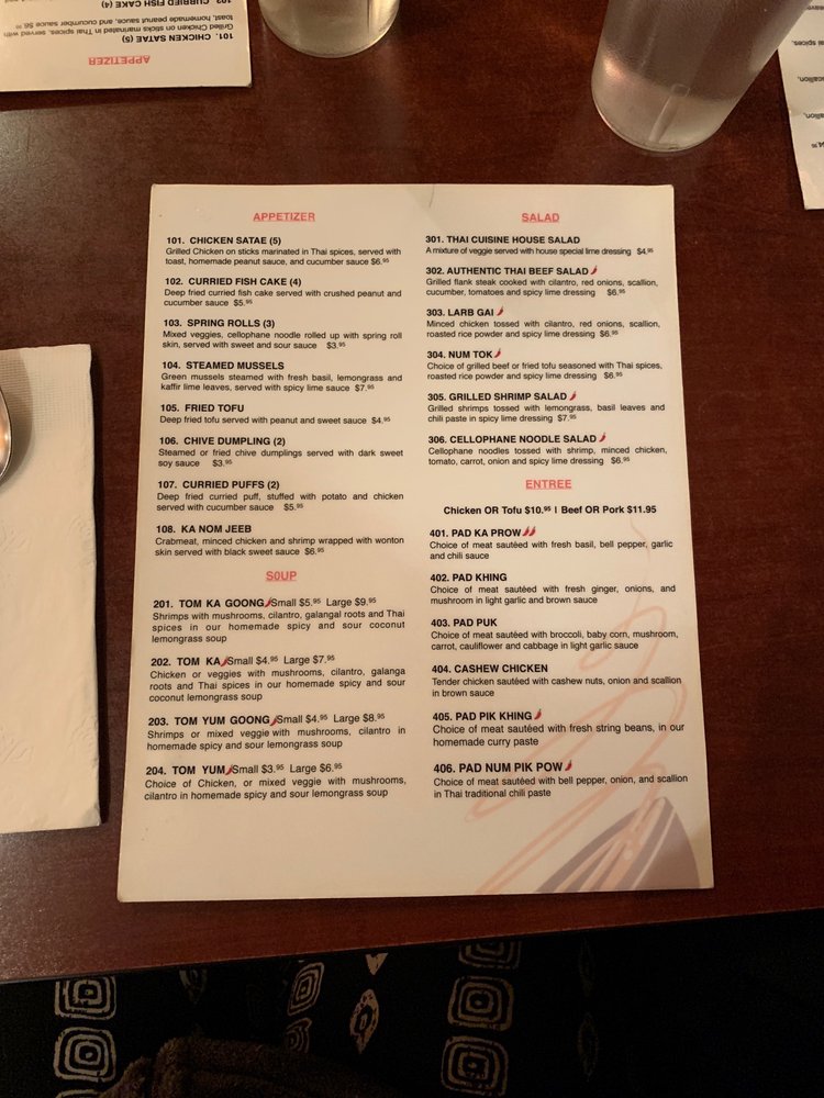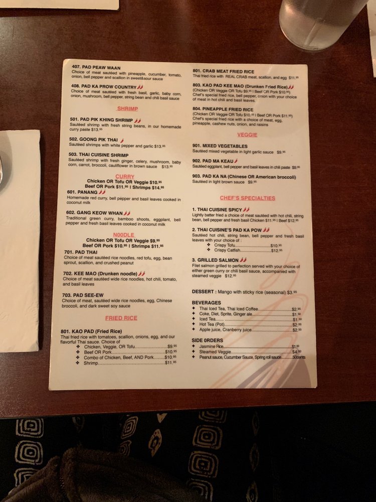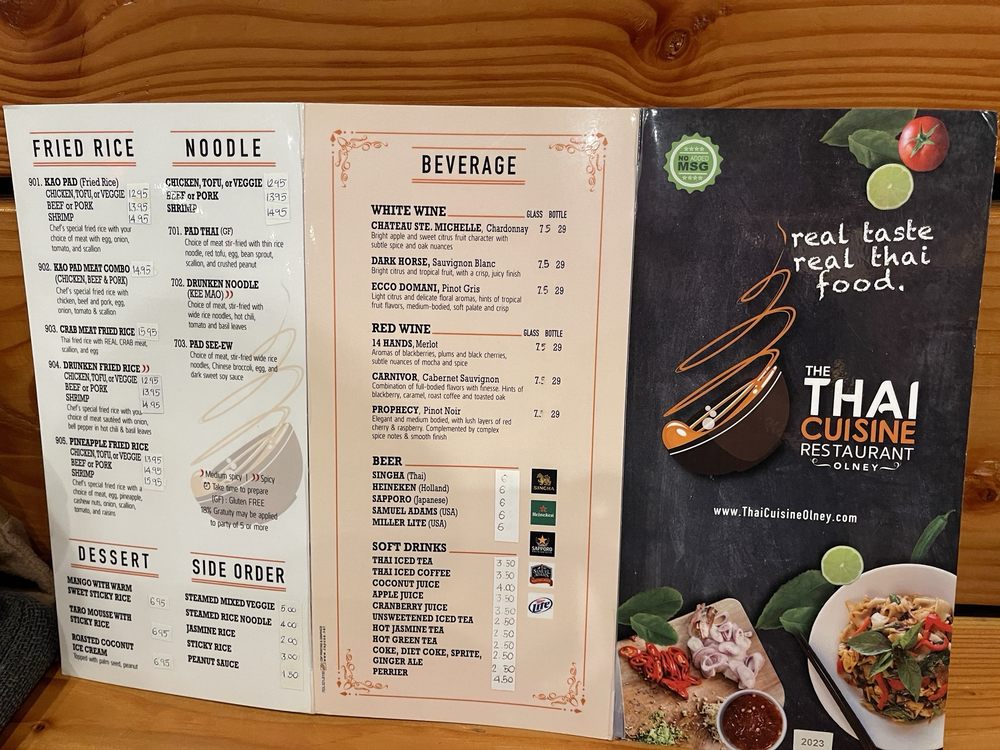 Introducing the menu at Thai Cuisine - a Thai restaurant located in Olney, MD. Offering a wide range of authentic Thai dishes, including salads like the flavorful Thai Beef Salad and Cellophane Noodles Salad. For appetizers, indulge in the Chicken Sate and Crab In Tofu Sheet. Enjoy soups like Tom Ka and Tom Yum, each bursting with Thai spices and flavors. With a variety of options for vegetarians and meat-lovers alike, Thai Cuisine caters to all dietary preferences. The restaurant provides a casual dining experience with options for outdoor seating and waiter service. Overall, the menu at Thai Cuisine is a delightful journey through traditional Thai cuisine that will leave you craving for more.
